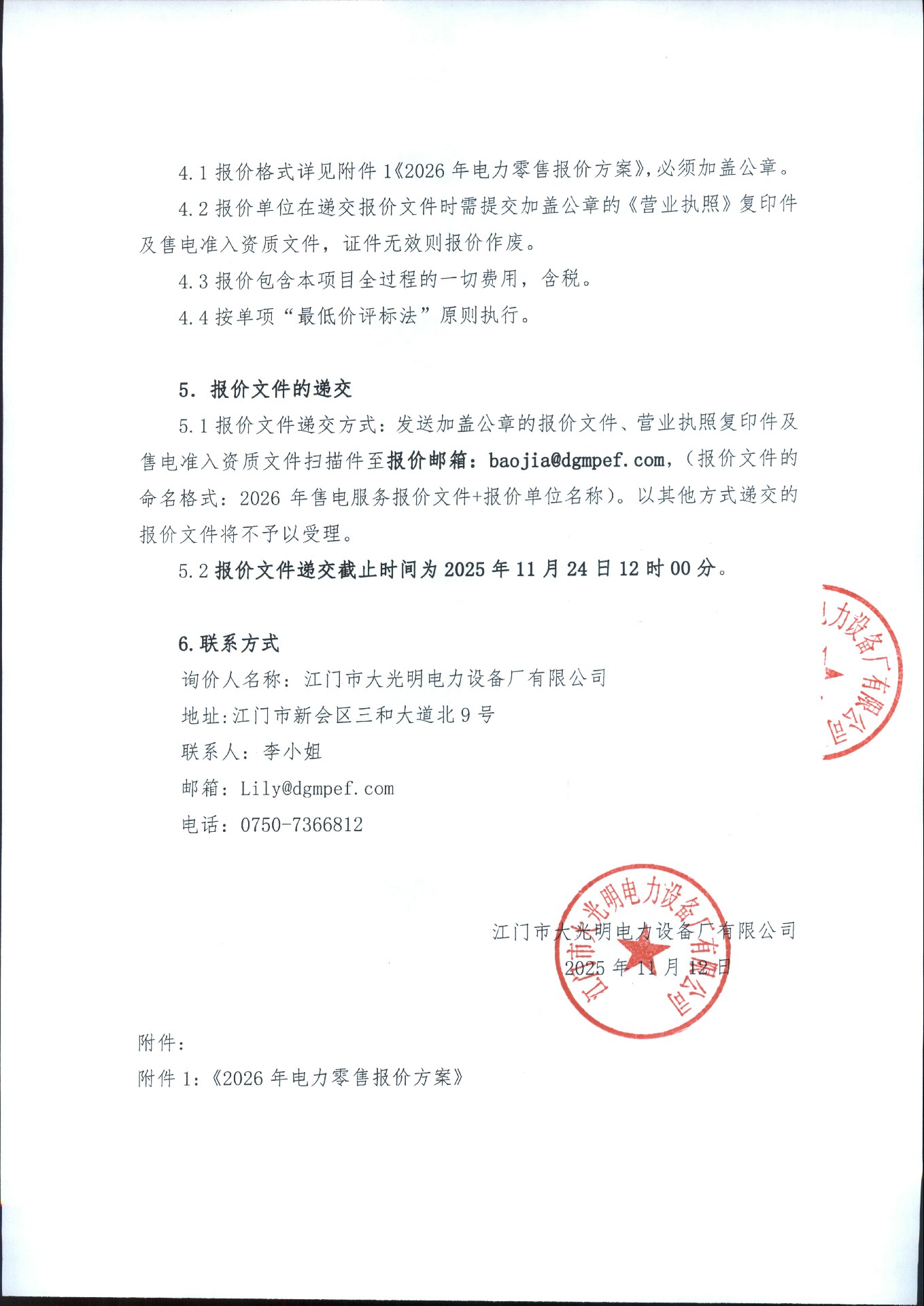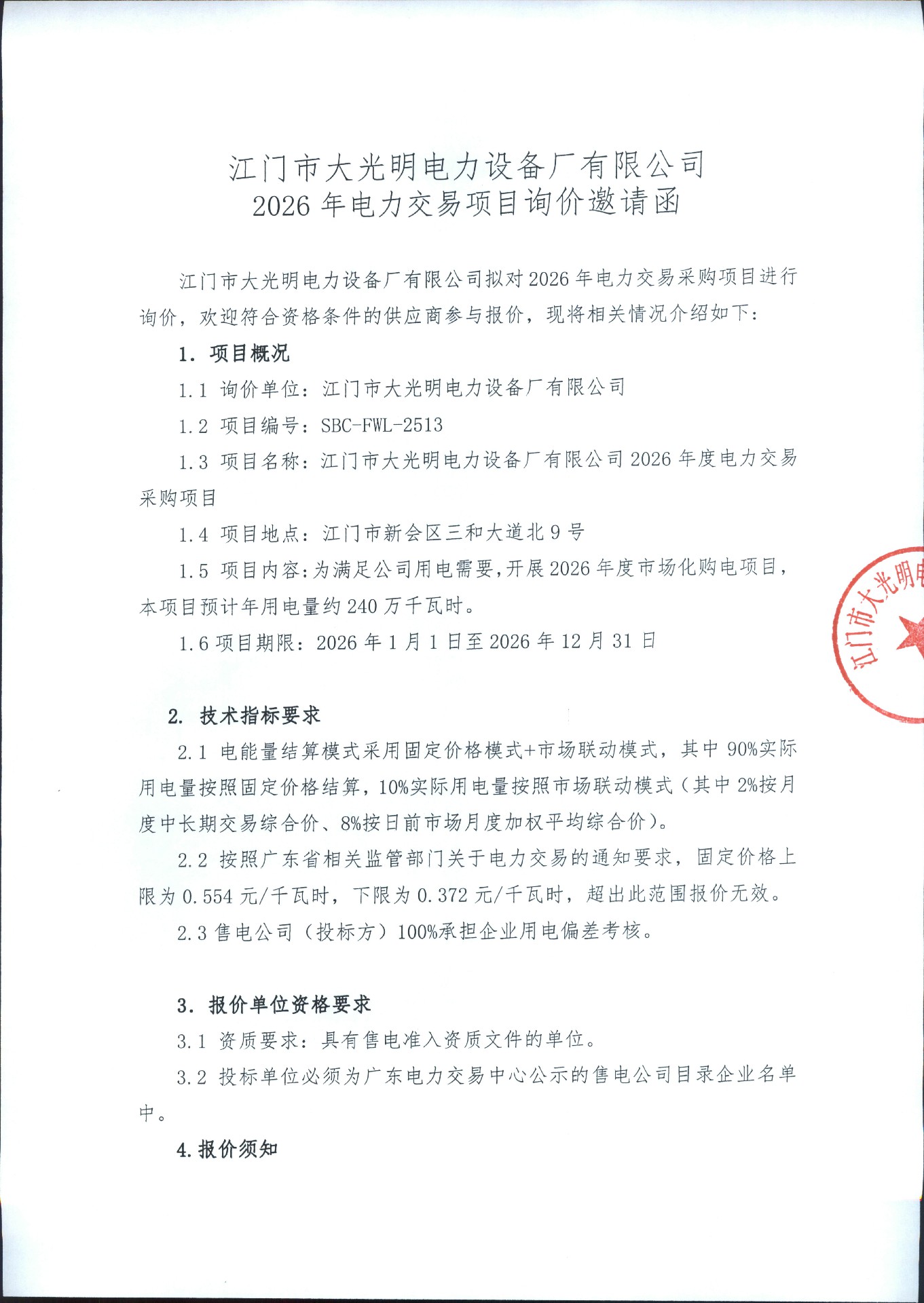 江门市大光明电力设备厂有限公司2026年电力交易项目询价邀请函