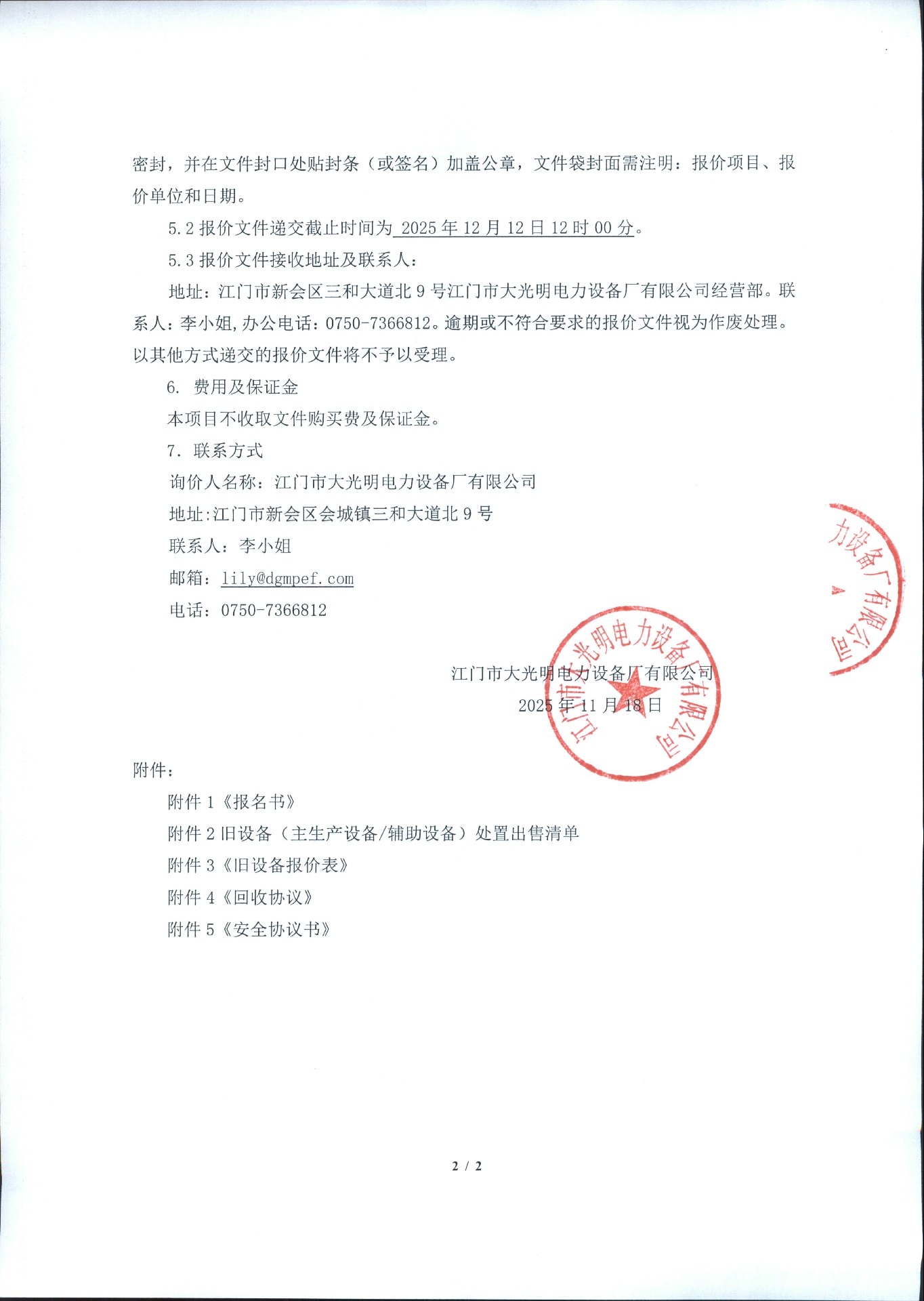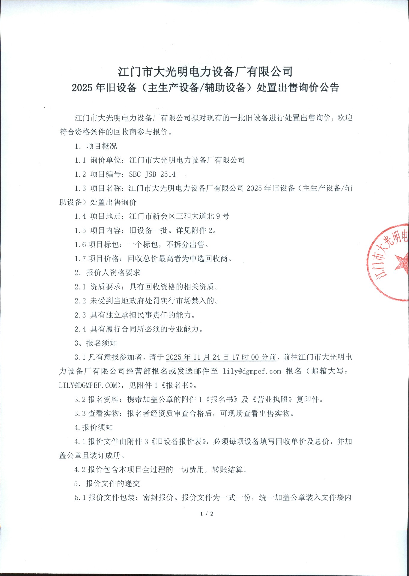 江门市大光明电力设备厂有限公司2025年旧设备(主生产设备/辅助设备)处置出售询价公告