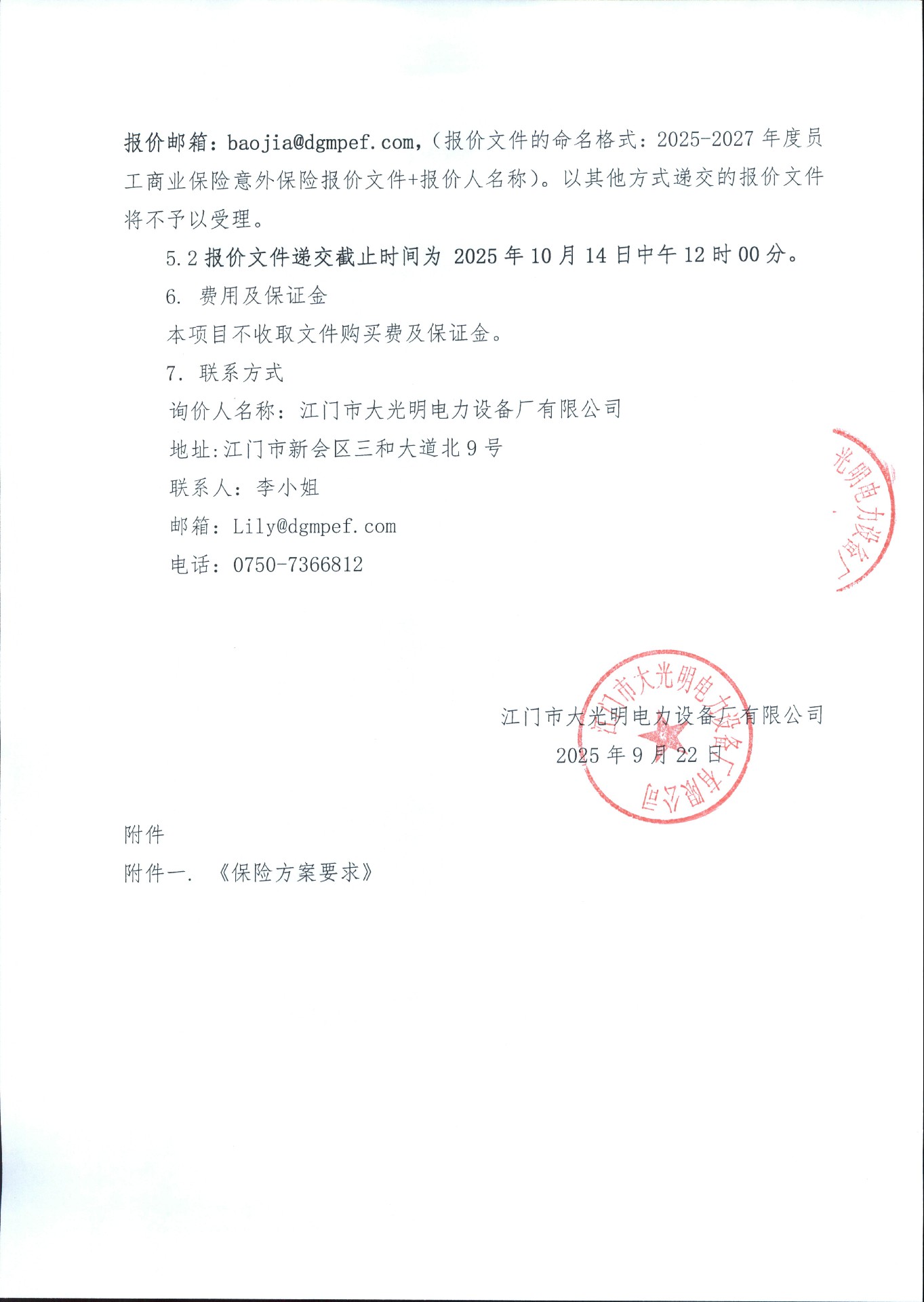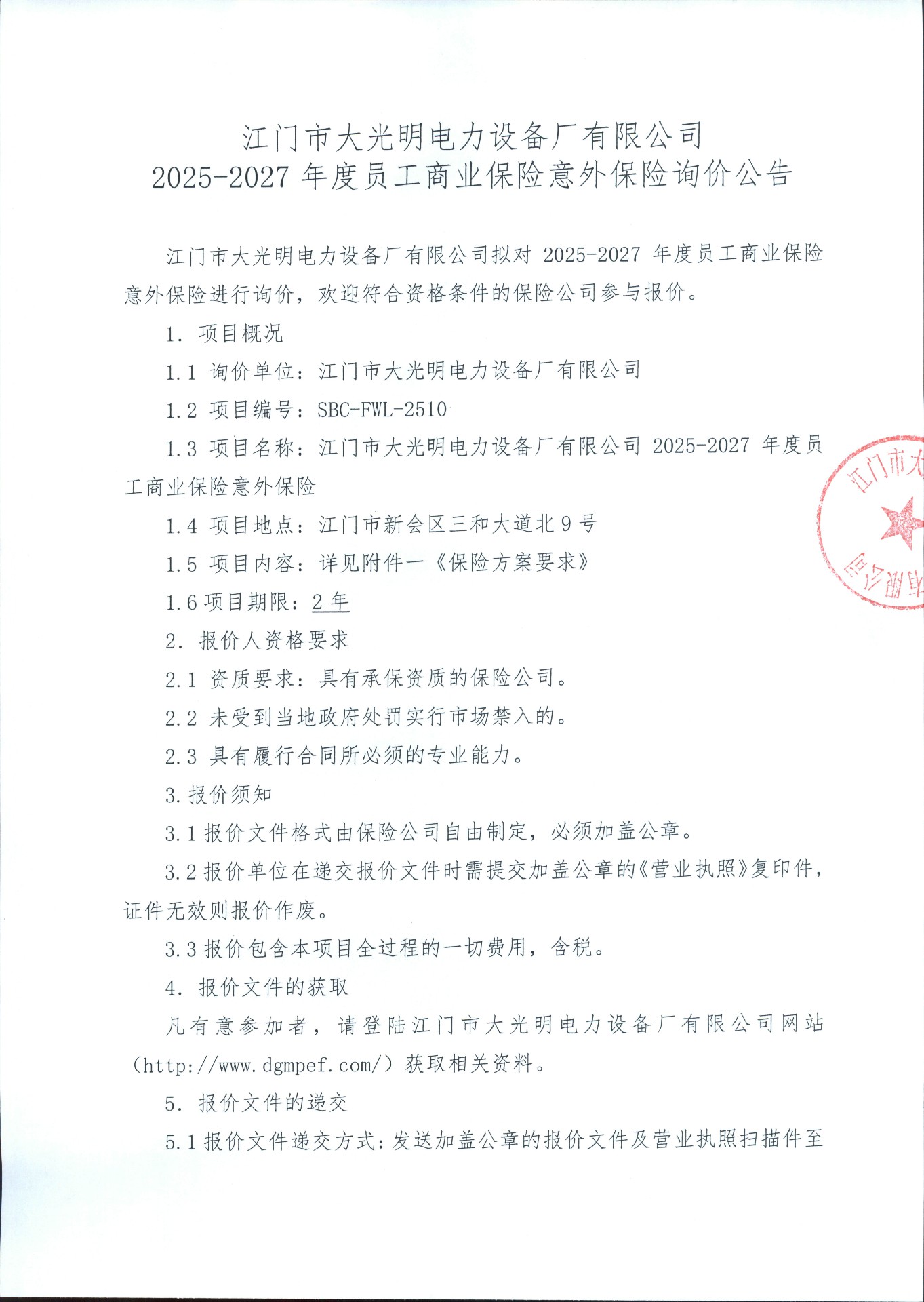 江门市大光明电力设备厂有限公司 2025-2027年度员工商业保险意外保险询价公告