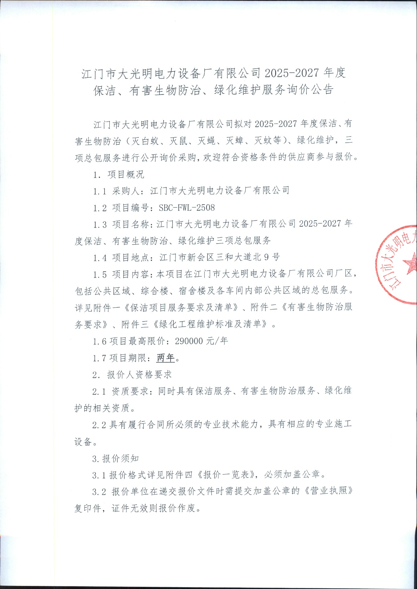 江门市大光明电力设备厂有限公司 2025年待处置资产价值评估服务询价结果公示